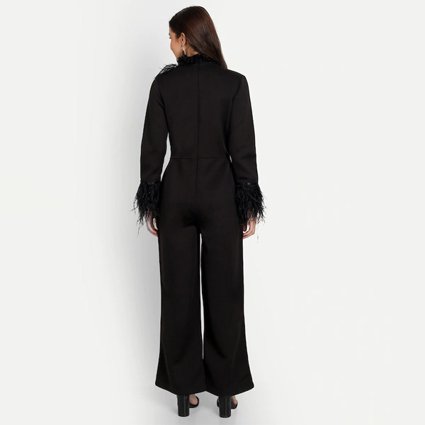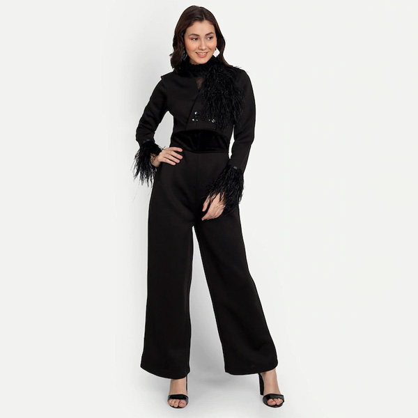 Black solid basic jumpsuit with embellished ,has a round neck, long sleeves, 2 pockets