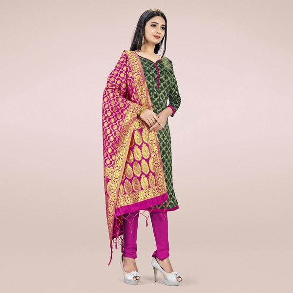 Green and pink woven design unstitched dress material
