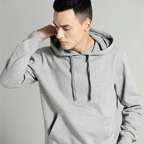 Grey melange solid sweatshirt, has a hood, long sleeves, 1 pocket, straight hem